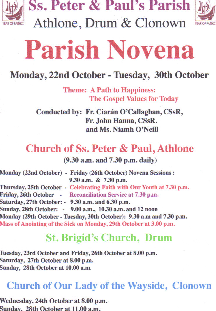 Novena from Monday 22nd to Tuesday 30th October in the 3 churches of the parish. Full programme attached (click image to open). Please note that the Novena will be held in Drum on Thursday at 8pm and not on Friday as advertised.